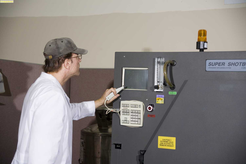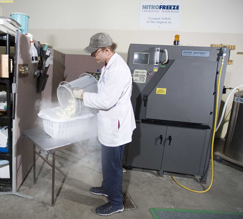 Cryogenic Deburring Process  - step 22: Basket is inserted into a stainless steel (lined) chamber and tumbles at a programmed rate while gaseous nitrogen is introduced to lower the temperature in the chamber.
